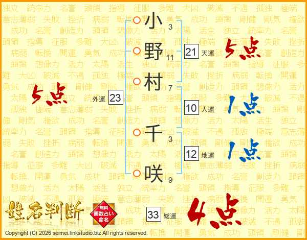 小野村千咲さんの総運は33画の4点!
