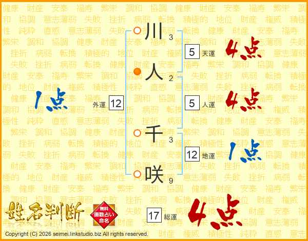生活面を象徴する運勢です。外部から受ける影響力を表し、結婚運、家庭運や職場、環境への順応性を表します。総運から人運を引いた画数。姓や名が1文字の場合を除く。