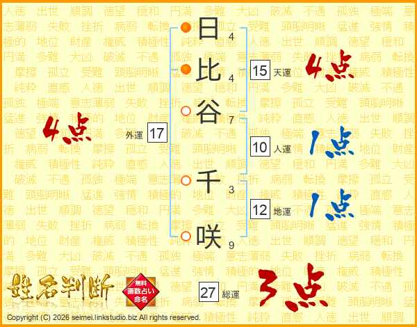 日(4画)比(4画)谷(7画) 千(3画)咲(9画)