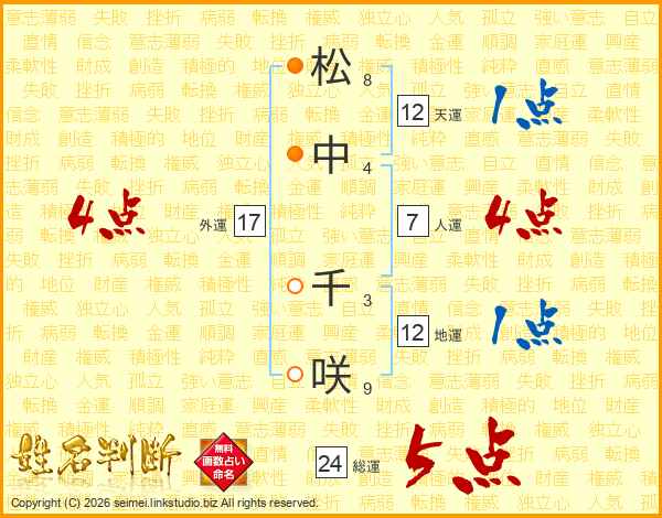 生活面を象徴する運勢です。外部から受ける影響力を表し、結婚運、家庭運や職場、環境への順応性を表します。総運から人運を引いた画数。姓や名が1文字の場合を除く。