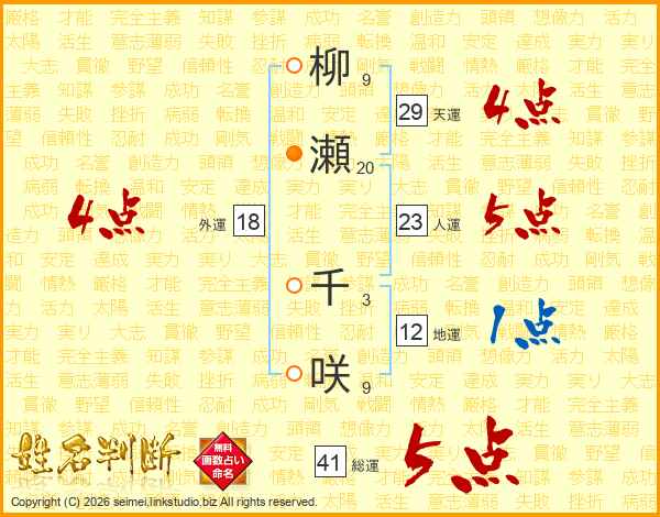 柳瀬千咲さんの総運は41画の5点!