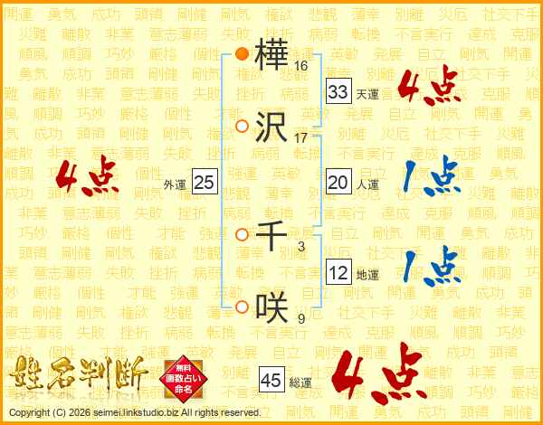 樺沢千咲さんの天運は33画の4点!