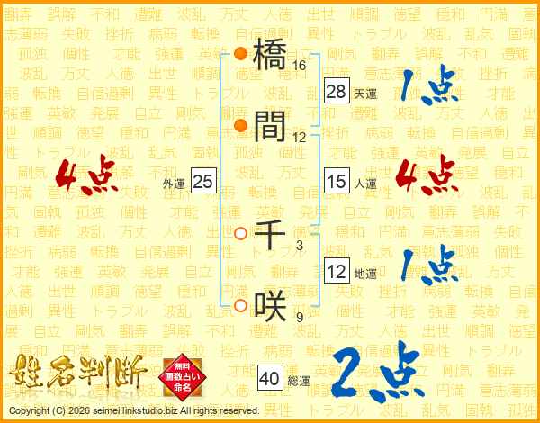 生活面を象徴する運勢です。外部から受ける影響力を表し、結婚運、家庭運や職場、環境への順応性を表します。総運から人運を引いた画数。姓や名が1文字の場合を除く。