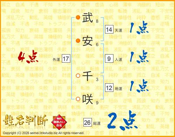 武安千咲さんの総運は26画の2点!