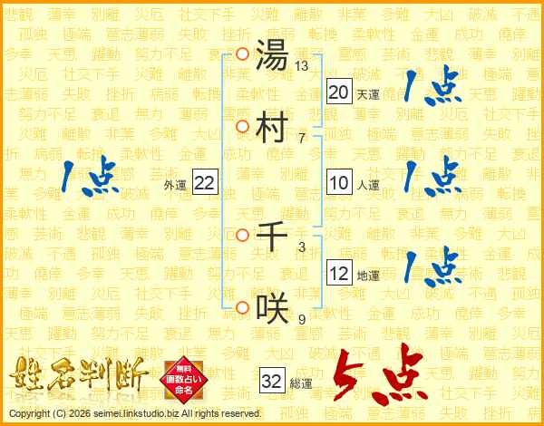 生活面を象徴する運勢です。外部から受ける影響力を表し、結婚運、家庭運や職場、環境への順応性を表します。総運から人運を引いた画数。姓や名が1文字の場合を除く。