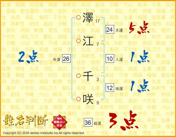 澤(17画)江(7画) 千(3画)咲(9画)
