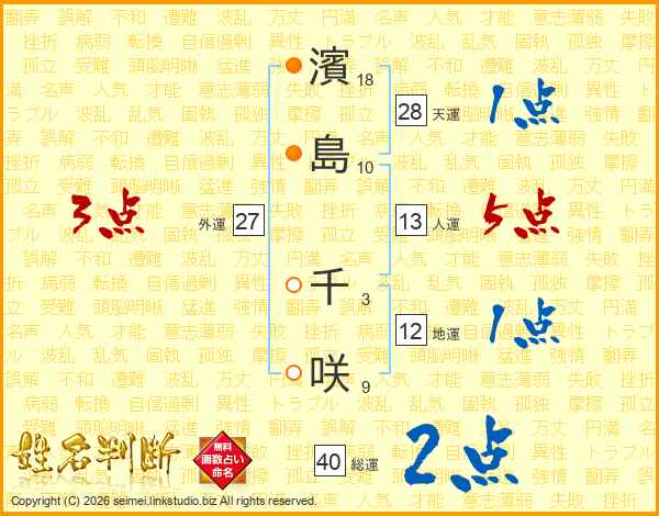 濱(18画)島(10画) 千(3画)咲(9画)