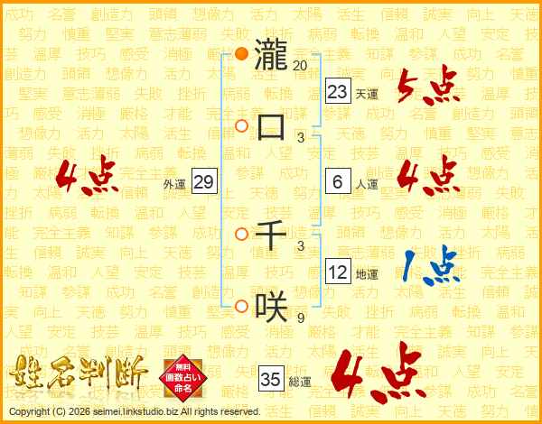 瀧口千咲さんの天運は23画の5点!