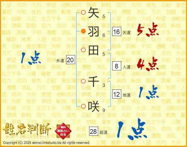 矢(5画)羽(6画)田(5画) 千(3画)咲(9画)