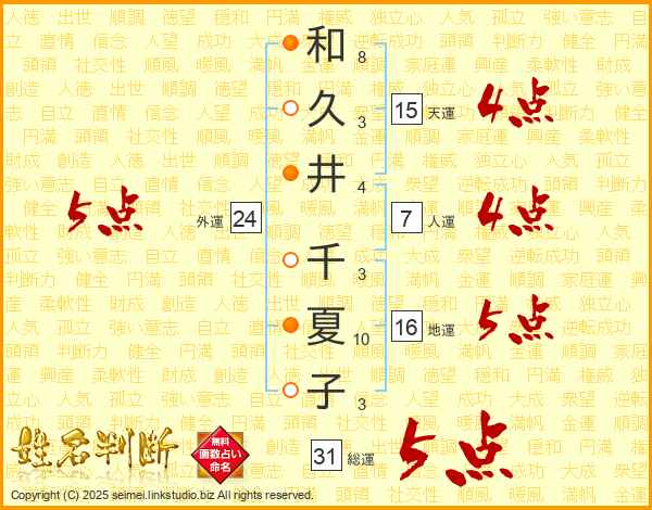 和(8画)久(3画)井(4画) 千(3画)夏(10画)子(3画)