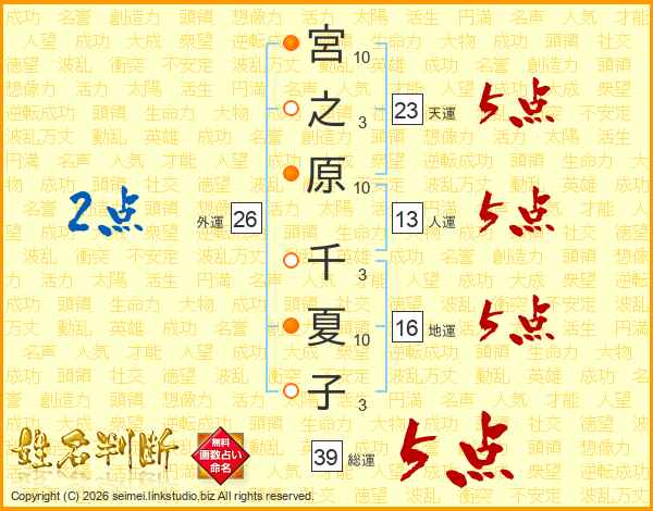宮之原千夏子さんの総運は39画の5点!