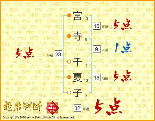 宮(10画)寺(6画) 千(3画)夏(10画)子(3画)