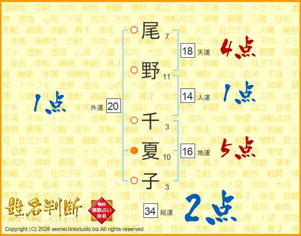 尾(7画)野(11画) 千(3画)夏(10画)子(3画)