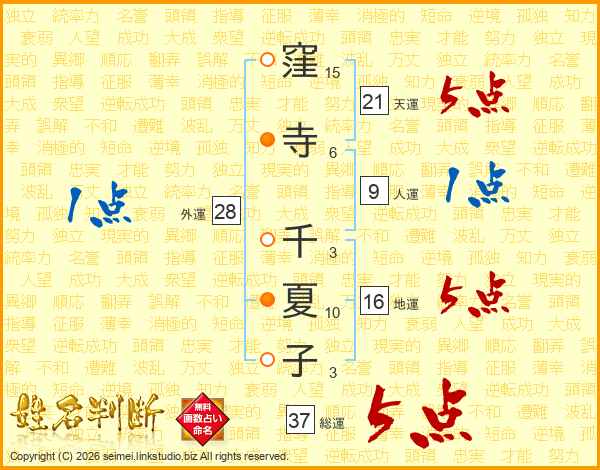 窪(15画)寺(6画) 千(3画)夏(10画)子(3画)