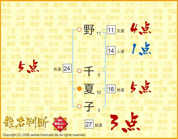 野(11画) 千(3画)夏(10画)子(3画)