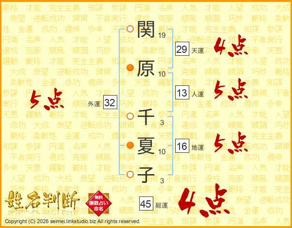 関原千夏子さんの総運は45画の4点!