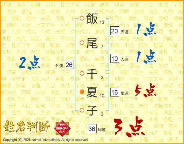 飯(13画)尾(7画) 千(3画)夏(10画)子(3画)