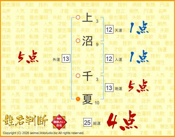 生活面を象徴する運勢です。外部から受ける影響力を表し、結婚運、家庭運や職場、環境への順応性を表します。総運から人運を引いた画数。姓や名が1文字の場合を除く。