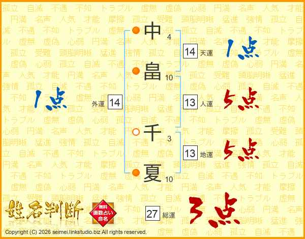 中(4画)畠(10画) 千(3画)夏(10画)
