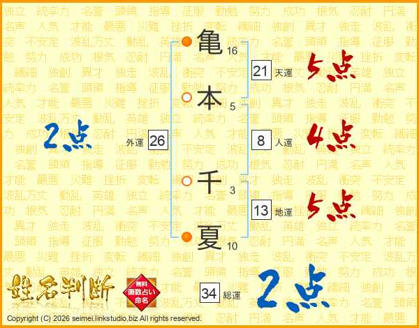 亀本千夏さんの天運は21画の5点!