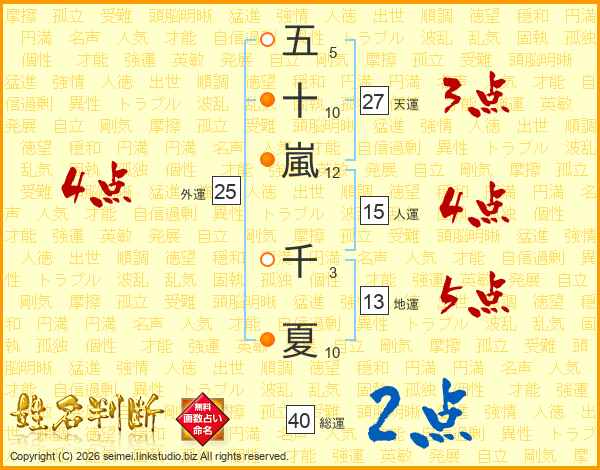 五(5画)十(10画)嵐(12画) 千(3画)夏(10画)
