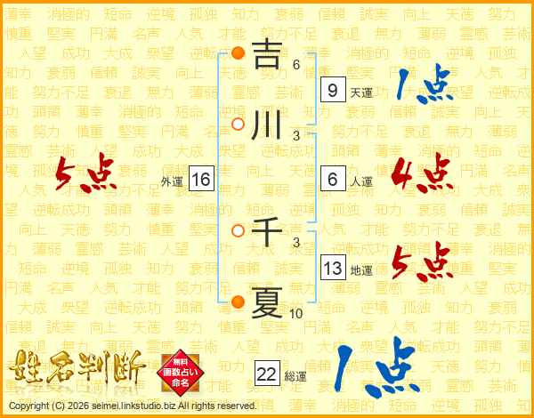 生活面を象徴する運勢です。外部から受ける影響力を表し、結婚運、家庭運や職場、環境への順応性を表します。総運から人運を引いた画数。姓や名が1文字の場合を除く。