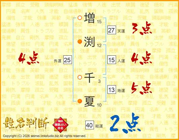 増(15画)渕(12画) 千(3画)夏(10画)