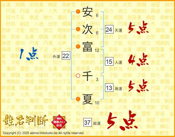安(6画)次(6画)富(12画) 千(3画)夏(10画)