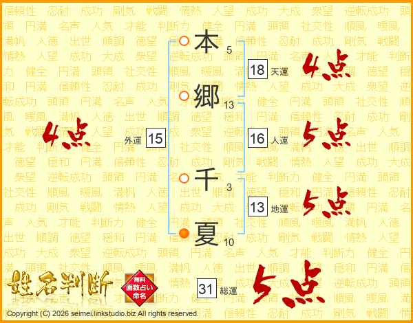 本郷千夏さんの総運は31画の5点!