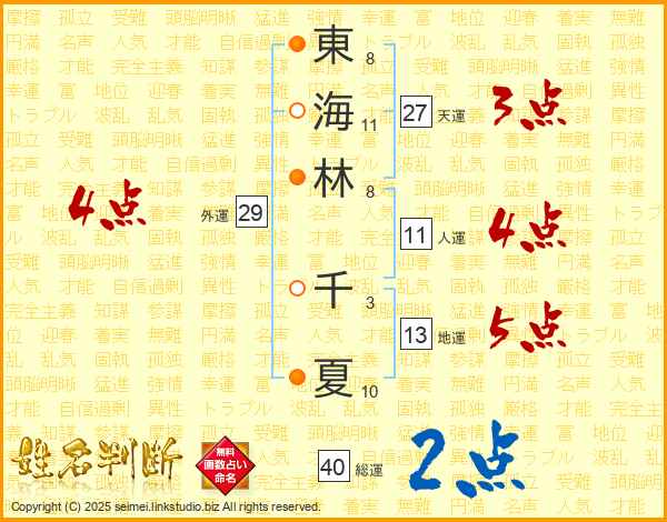 東(8画)海(11画)林(8画) 千(3画)夏(10画)