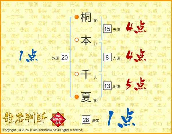 あなたの人生を表す1番重要な運勢です。生涯を通じて影響する総合運となり、主に50歳以降の晩年期に影響を及ぼします。苗字と名前の合計画数。