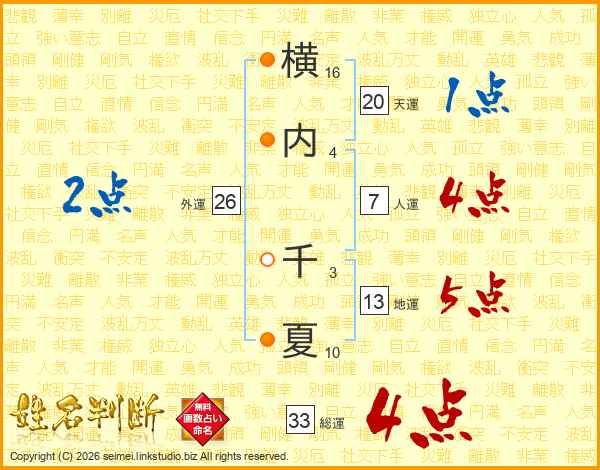 生活面を象徴する運勢です。外部から受ける影響力を表し、結婚運、家庭運や職場、環境への順応性を表します。総運から人運を引いた画数。姓や名が1文字の場合を除く。