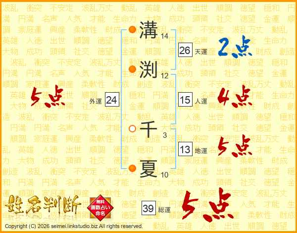 溝(14画)渕(12画) 千(3画)夏(10画)