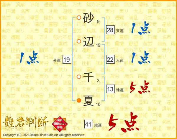 砂辺千夏さんの総運は41画の5点!