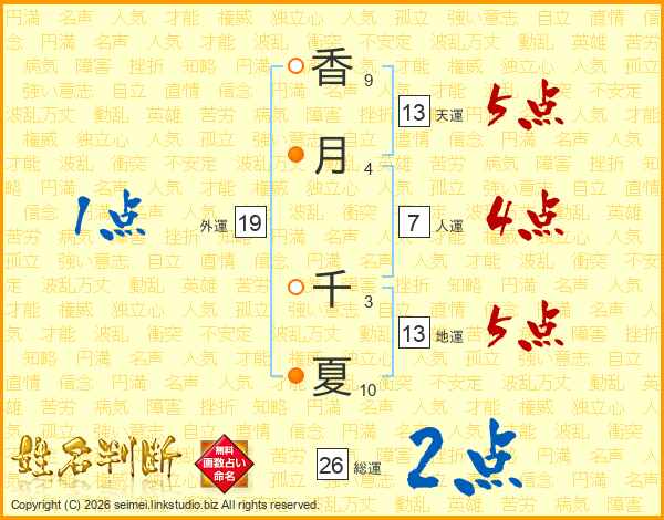 香月千夏さんの総運は26画の2点!