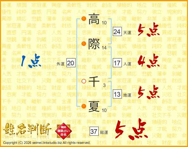 生活面を象徴する運勢です。外部から受ける影響力を表し、結婚運、家庭運や職場、環境への順応性を表します。総運から人運を引いた画数。姓や名が1文字の場合を除く。