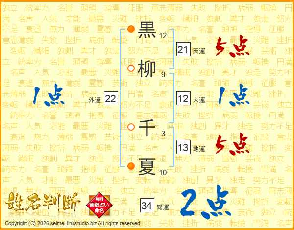 黒(12画)柳(9画) 千(3画)夏(10画)