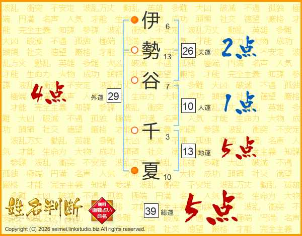 伊勢谷千夏さんの総運は39画の5点!