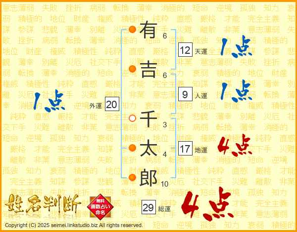 有吉千太郎さんの総運は29画の4点!