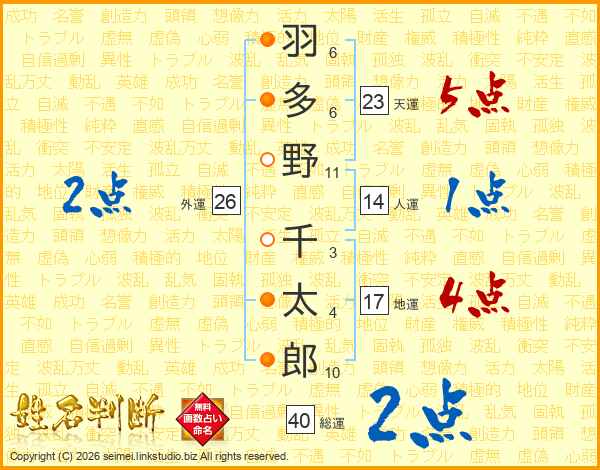 羽(6画)多(6画)野(11画) 千(3画)太(4画)郎(10画)