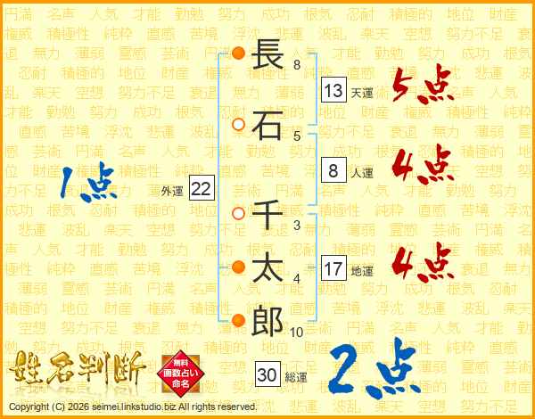 長(8画)石(5画) 千(3画)太(4画)郎(10画)