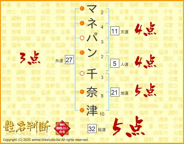 マ(2画)ネ(4画)パ(3画)ン(2画) 千(3画)奈(8画)津(10画)