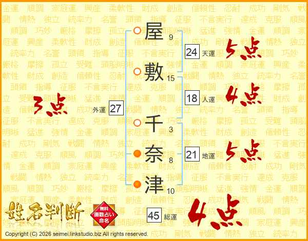 屋(9画)敷(15画) 千(3画)奈(8画)津(10画)