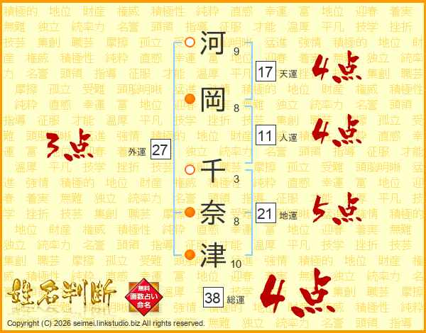 河(9画)岡(8画) 千(3画)奈(8画)津(10画)