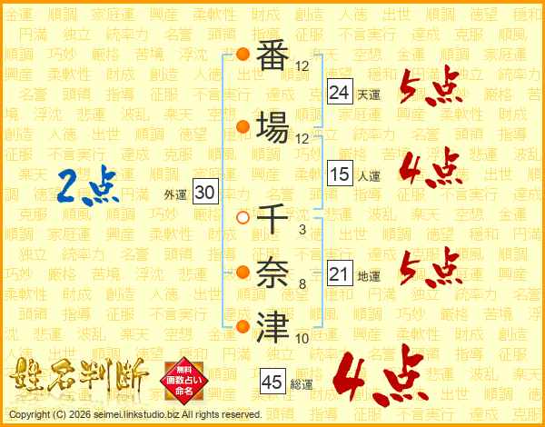 番(12画)場(12画) 千(3画)奈(8画)津(10画)