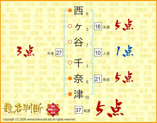 西(6画)ヶ(3画)谷(7画) 千(3画)奈(8画)津(10画)