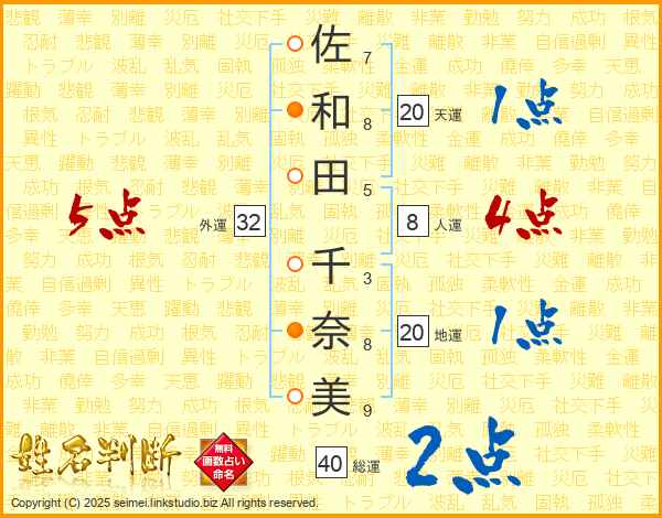 佐(7画)和(8画)田(5画) 千(3画)奈(8画)美(9画)