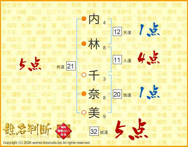 内林千奈美さんの総運は32画の5点!