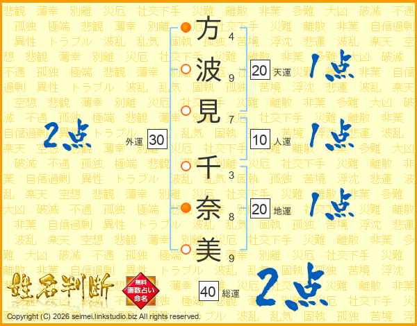 方(4画)波(9画)見(7画) 千(3画)奈(8画)美(9画)