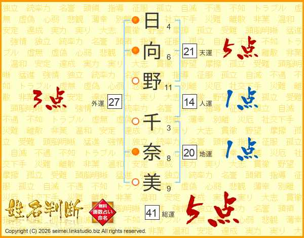 日(4画)向(6画)野(11画) 千(3画)奈(8画)美(9画)